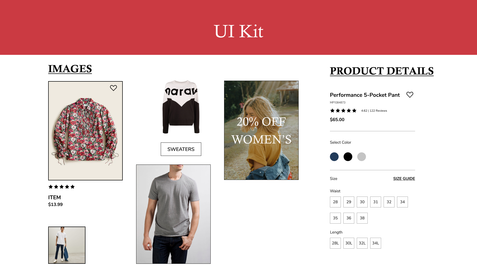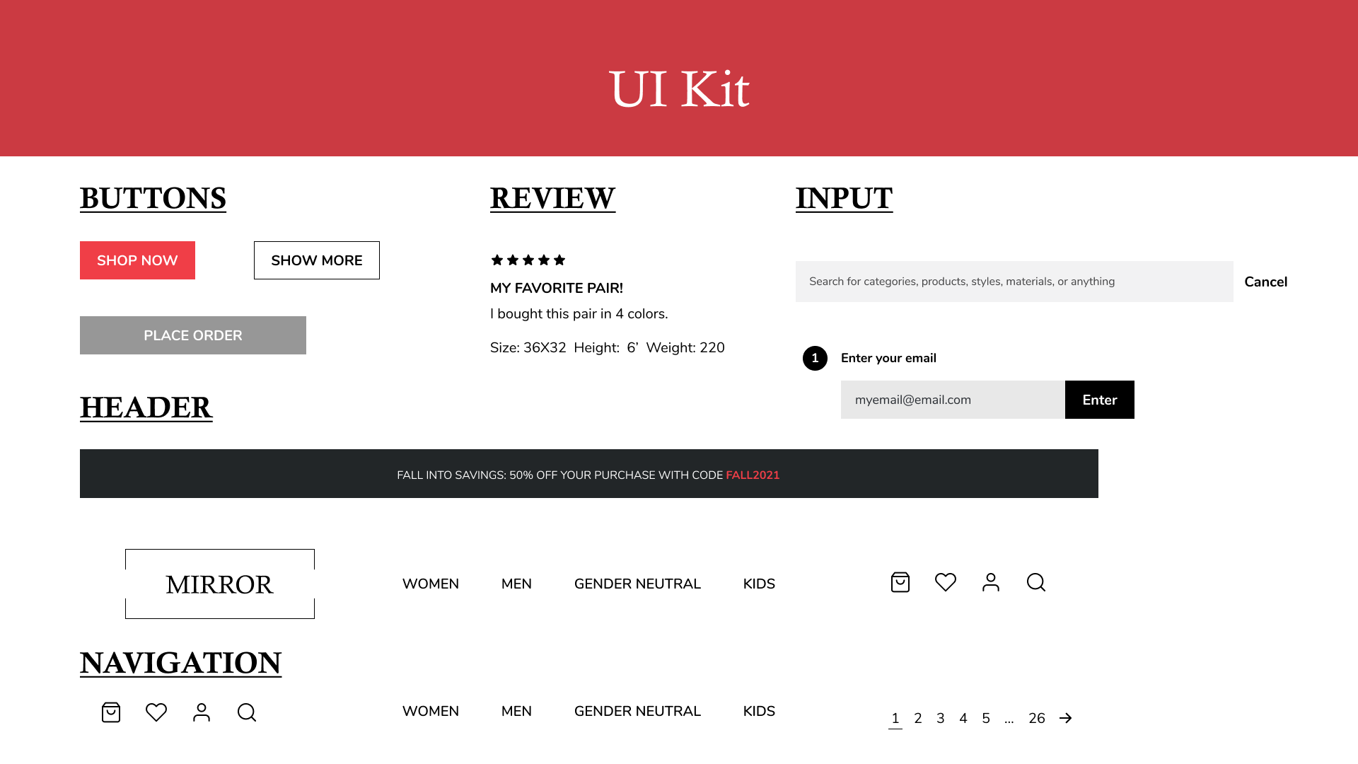 I created a mood board to create a high fidelity wireframe. The board helped me look for trendy, casual fashion ideas that helped influence the typography, colors, and logo for Mirror’s rebranding. From the mood board I moved on to a style tile to develop consistency in the high fidelity design.