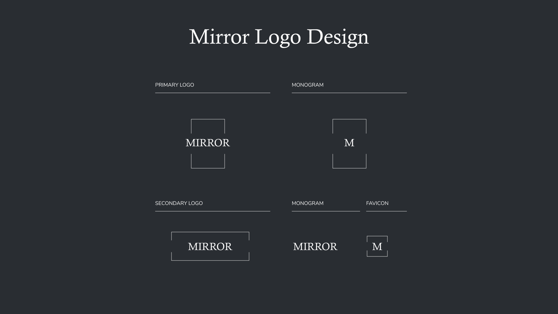 I ended up choosing a logo for Mirror that had elements found in other stores with its target market. These logos tend to be minimal. I used lines to create lines reflecting around the word “Mirror”. The lines form the shape of a mirror. The logo then can be adjusted to a horizontal format. For our responsive design, I minimized the logo with a singular capital M while keeping the mirror element with the lines.