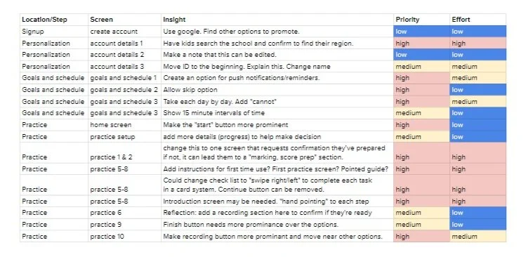 I laid out all my notes in an affinity diagram categorizing the notes into wins, confusion, ideas that were brought up during testing, and possible next steps.